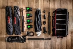 Photography equipment arranged on a wooden floor, including tripods, softboxes, a camera, lenses, wireless transmitters, light stands, power cords, and a laptop.