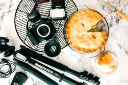 Cameras and lenses arranged on a wooden surface, accompanied by two Kodak Portra 400 film boxes.