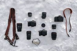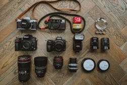 Camera equipment including a DSLR with lens, additional lens, film camera, flash, filter, batteries, and film roll, arranged on a white background.